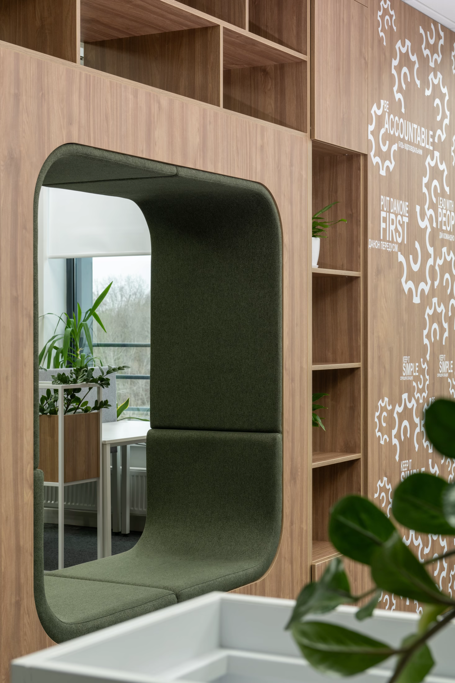 Проєкт реалізовано з урахуванням усіх вимог компанії Danone, включаючи створення функціональних рішень для простору, що підходять для щоденної діяльності глобальної компанії. Виробництво меблів здійснено на власному виробництві Zest, що дозволило реалізувати проєкт з високою точністю. Співпраця з меблевою компанією, яка має власне виробництво, відкриває можливість отримати продукт, що повністю адаптований до індивідуальних потреб замовника — це оптимальне співвідношення ціни, якості та швидкості виконання проєкту.
